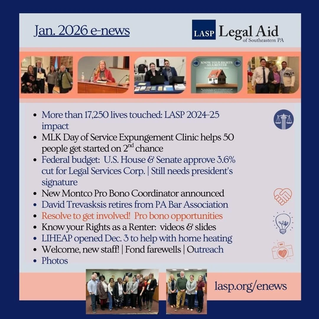 In each monthly e-news, you'll find: What's new at LASP & the 4 counties | New developments & updates on programs to help residents with low incomes | Current pro bono opportunities & volunteer features | Photos from recent outreaches & events | Upcoming free legal clinics | Job announcements | & more! To subscribe, please fill out the form at right.