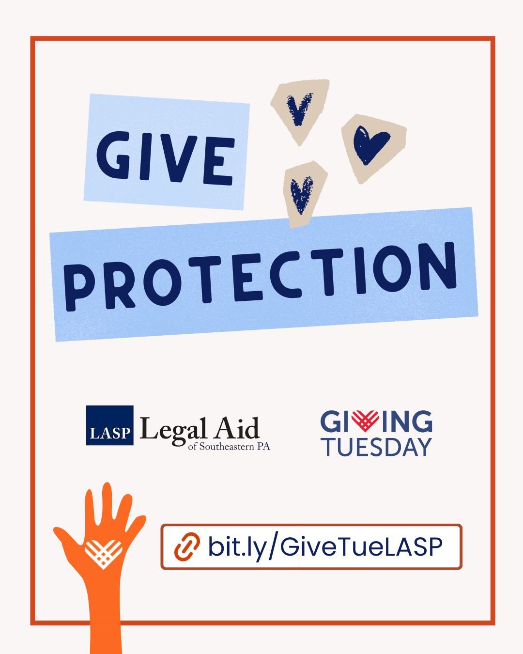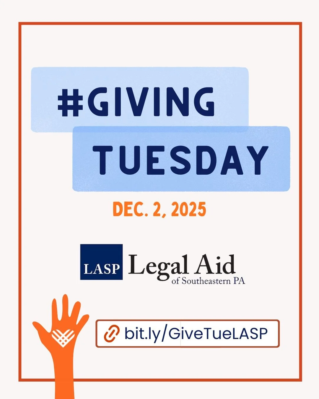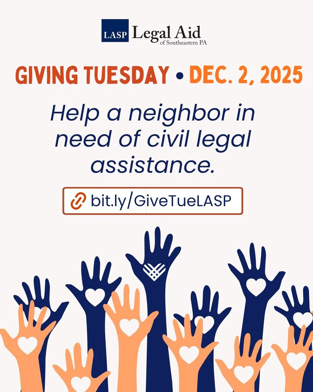 Then post to your preferred platform(s), tag us if possible ( @legalaidsepa on all platforms) and include the link to the LASP Giving Tuesday donation page: bit.ly/GiveTueLASP.