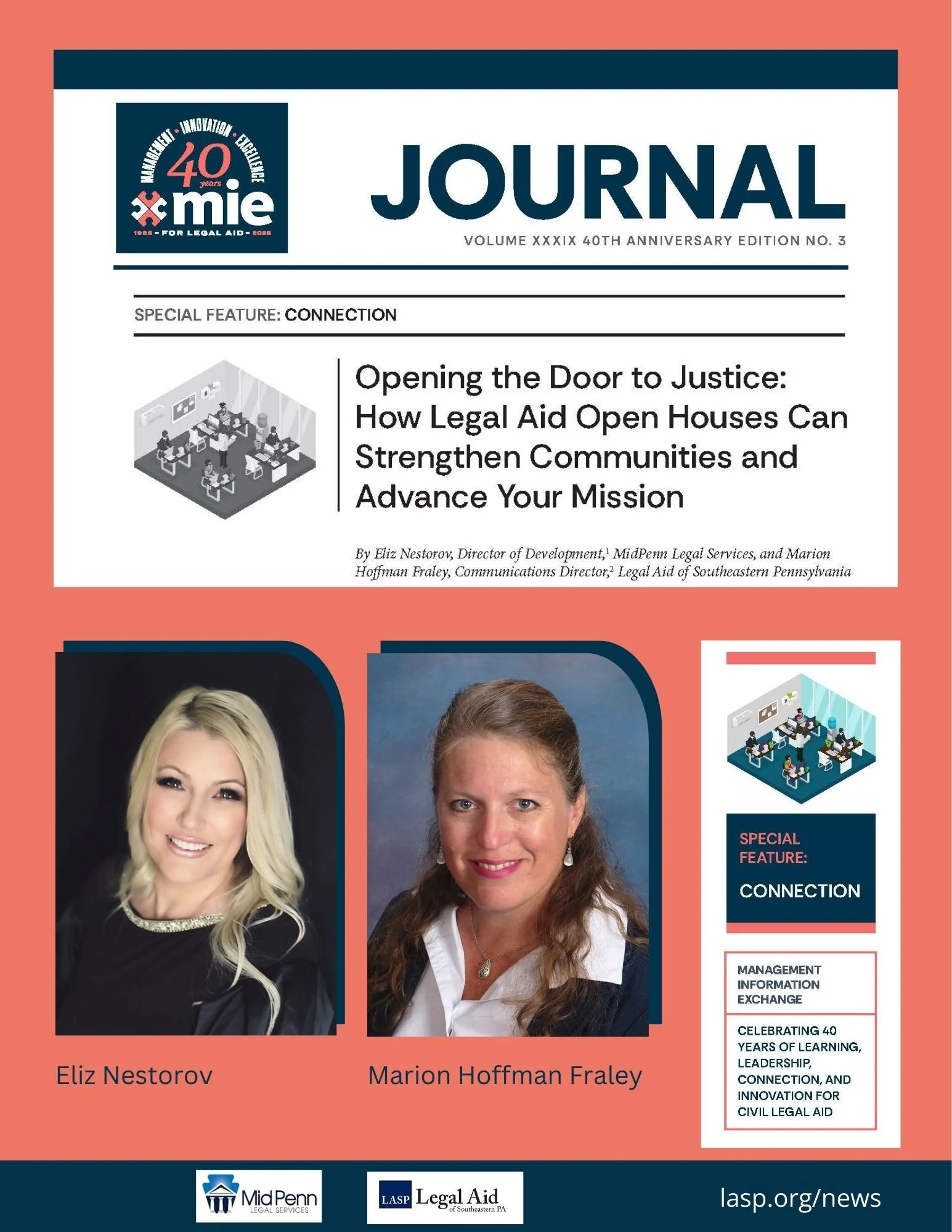 Eliz Nestorov, former Director of Development for MidPenn Legal Services, and Marion Hoffman Fraley, Communications Director for Legal Aid of Southeastern PA (LASP), shared their respective organizations’ experiences with open houses in the Management Information Exchange (MIE) Journal’s 40th anniversary edition. The issue, published in January 2026, focused on Connection.
