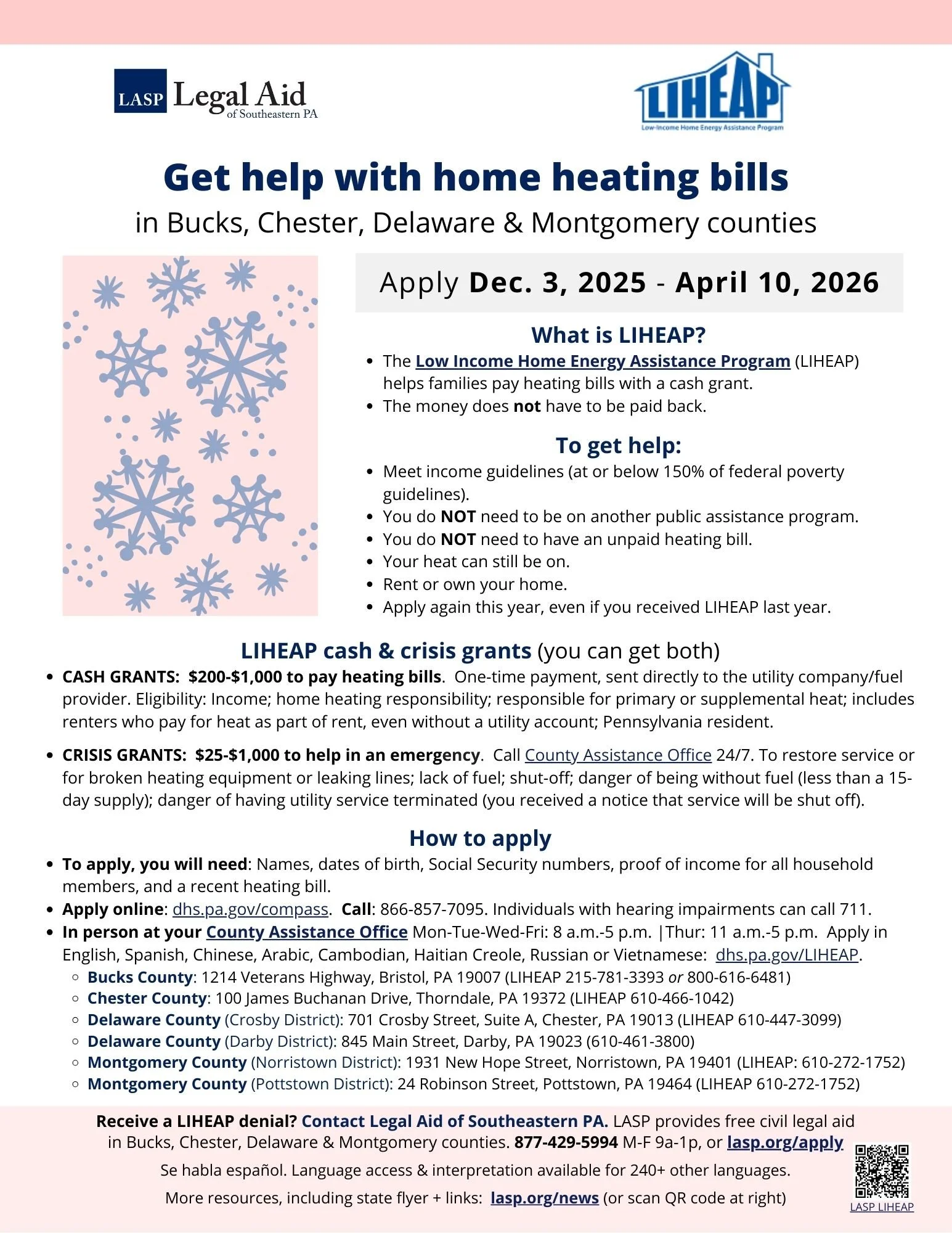 Legal Aid of Southeastern PA’s 2025-26 LIHEAP flyer for Bucks, Chester, Delaware & Montgomery counties (1-page PDF)