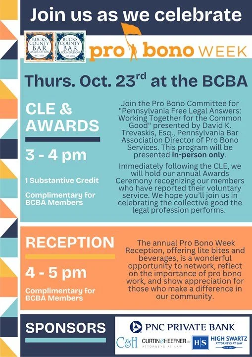 DOYLESTOWN - The Bucks County Bar Association will host a Pro Bono Week CLE and Celebration on Thursday, Oct. 23, 2025 from 3-5 p.m. at BCBA, 135 E. State St., Doylestown, PA 18901.