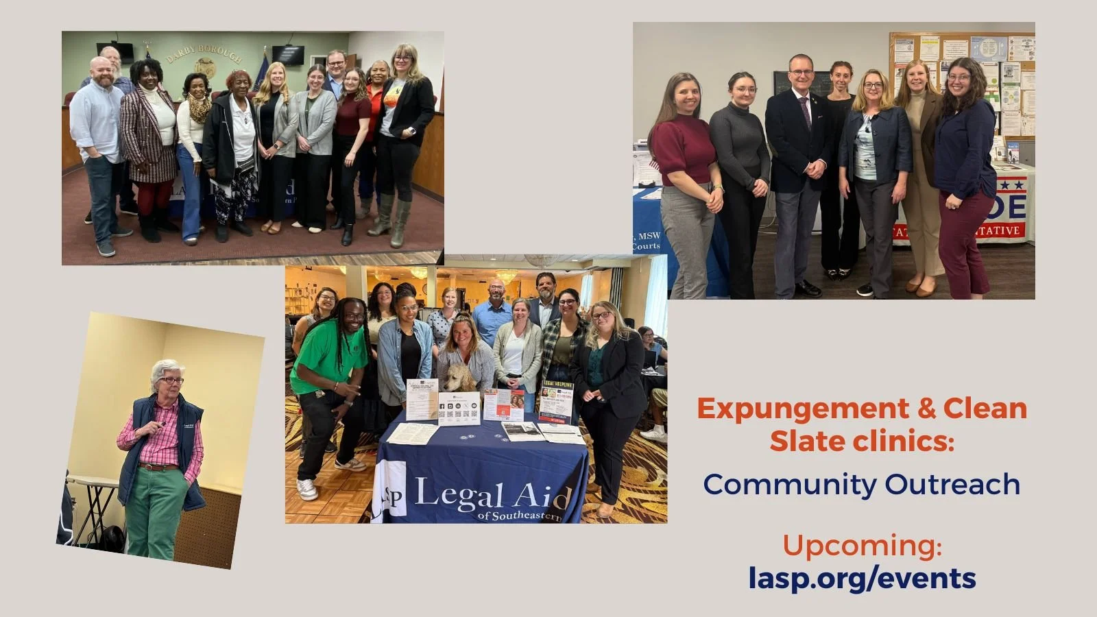 The photos show a sampling of Legal Aid of Southeastern PA attorneys and interns at outreach clinics and community events throughout the area, held in collaboration with partner organizations and legislators. Stay tuned to lasp.org/events for upcoming virtual and in-person clinics. LASP helps clients with expungements and Clean Slate (limited access).